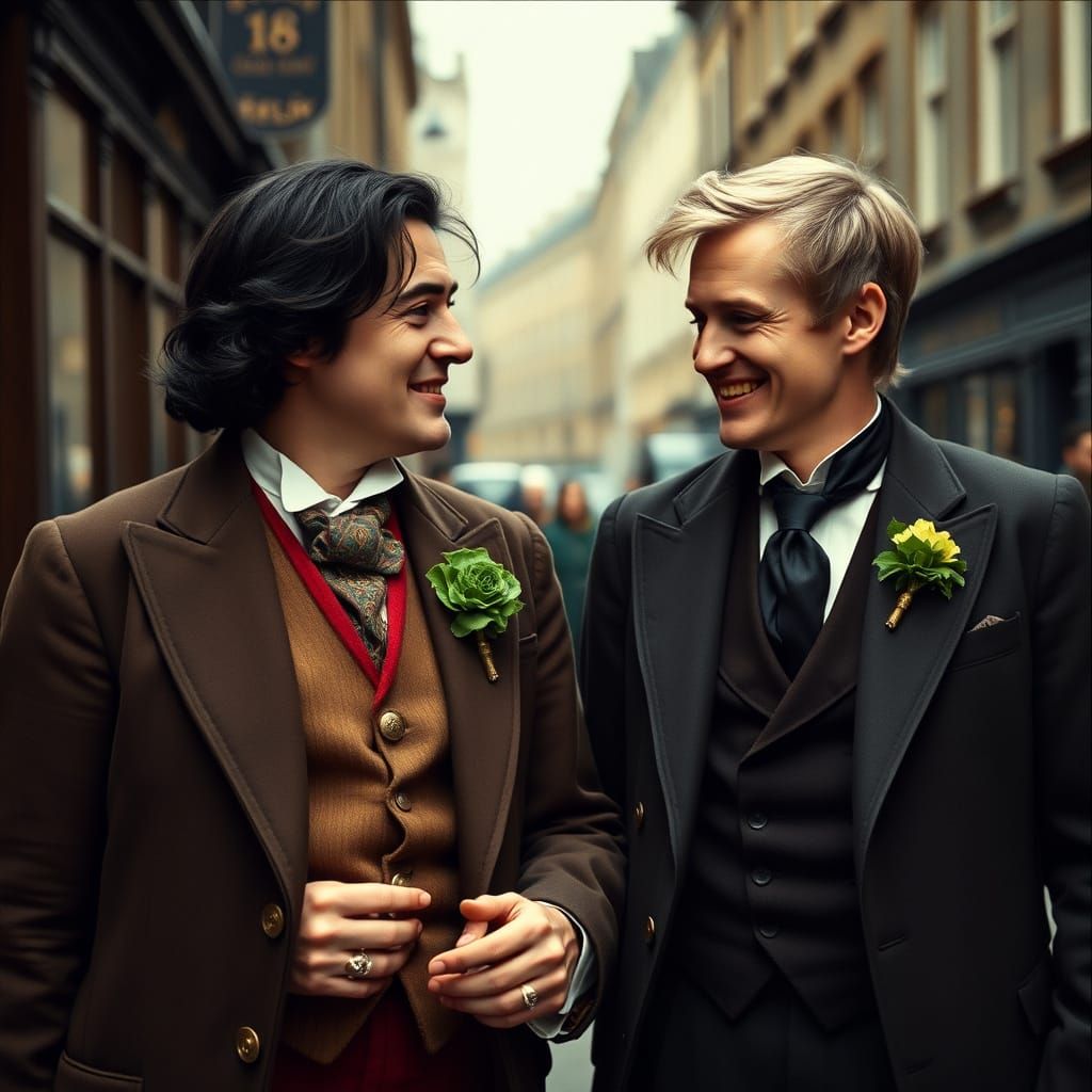 A cinematic film still of Oscar Wilde and Lord Alfred Douglas chatting on a 19th-century London street. The image has a warm, nostalgic color palette and a gritty 35mm film aesthetic.