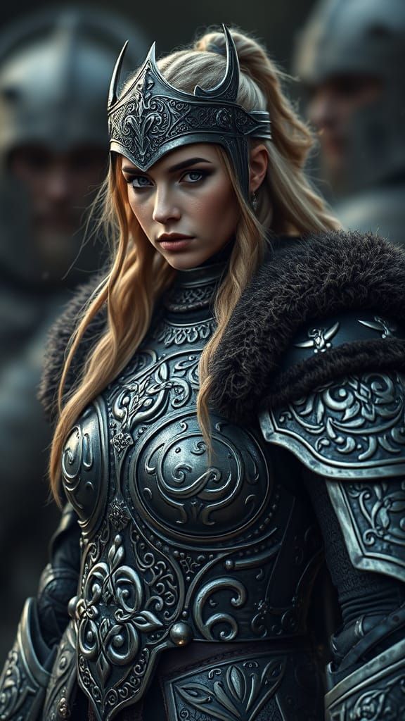 A full body shot of a Viking warrior woman in engraved pewter armor. Nordic runes decorate her armor, which features intricate carvings, dynamic lighting, and magical particles in a photorealistic style.