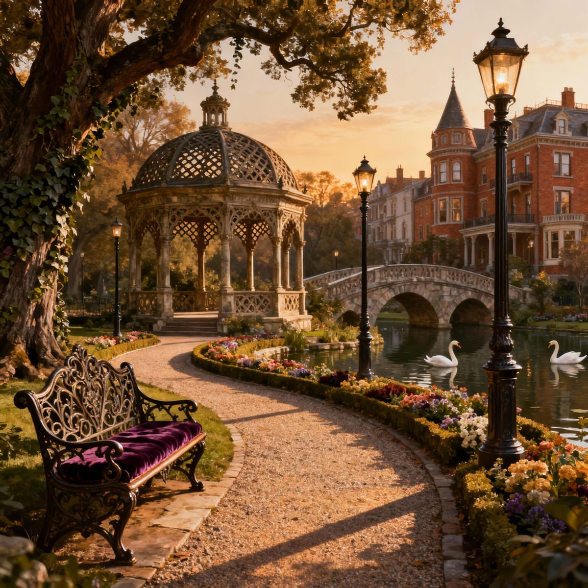 This image depicts a detailed matte painting of a serene Victorian city park, capturing the essence of a bygone era with its lush scenery and architectural elements.