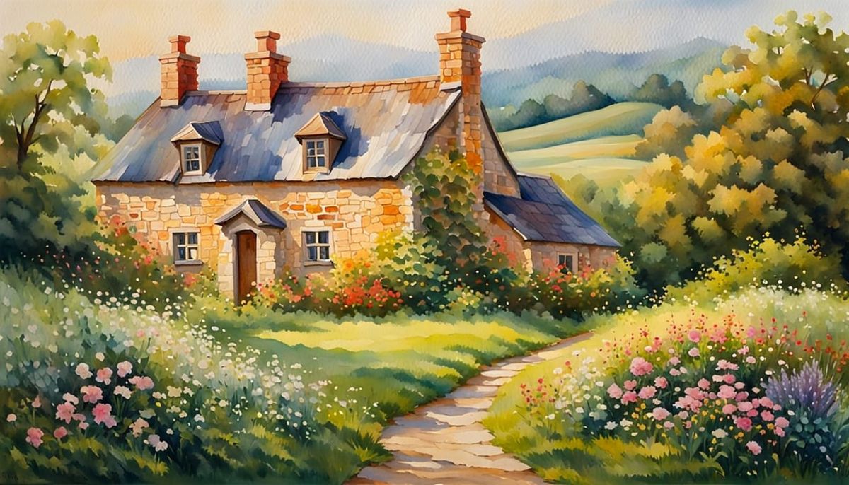 This image shows a stone cottage nestled in a vibrant green landscape, rendered as a watercolor painting. The scene is bathed in warm light, showcasing soft brushstrokes and muted colors in an impressionistic style.