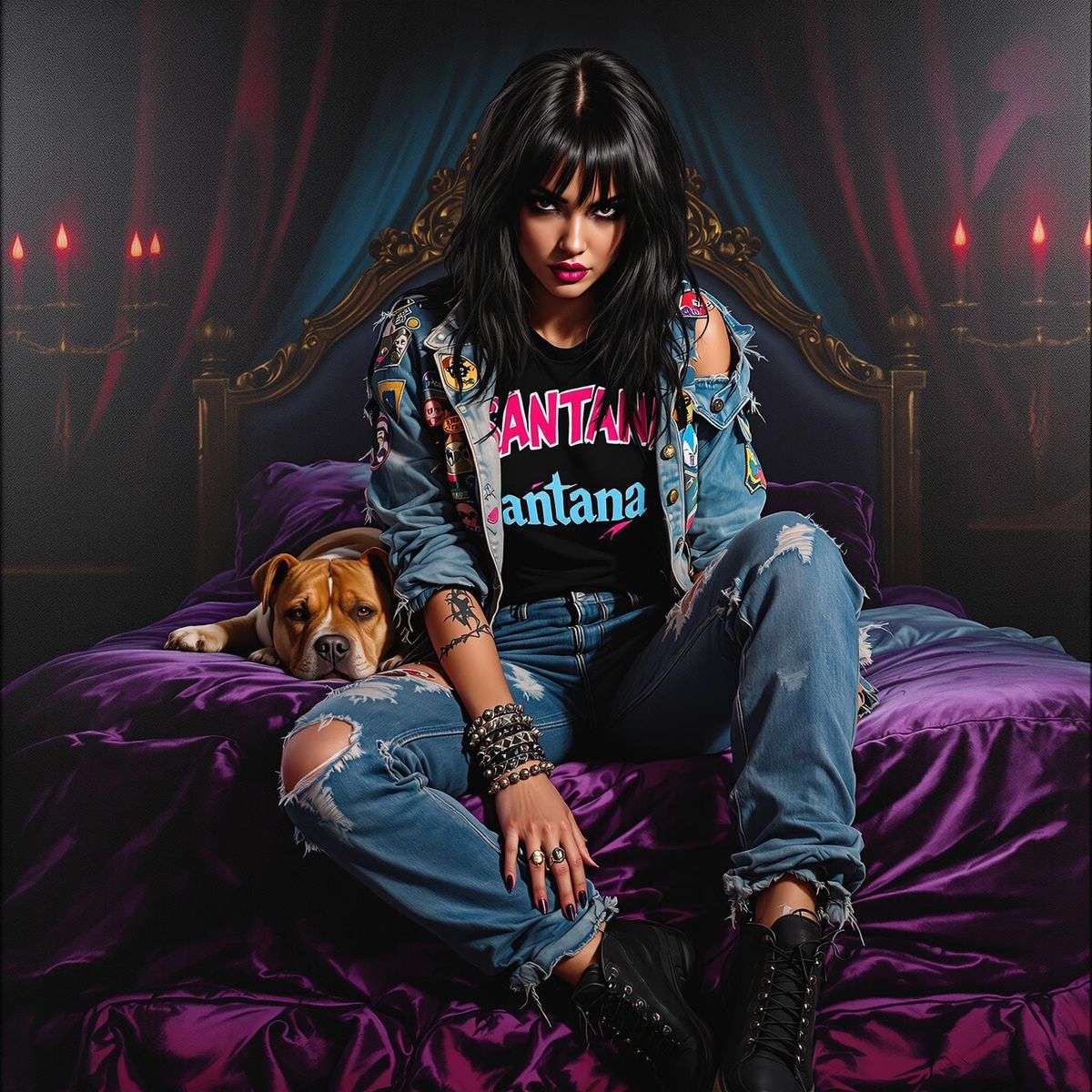 A striking oil painting of a 30-year-old woman in a bold, rock 'n' roll aesthetic, surrounded by a moody gothic bedroom and a loyal pit bull dog. Inspired by the expressive brushstrokes of Gottfried Bammes and the captivating colors of Henri de Toulouse-Lautrec, this vibrant artwork exudes high-octane en...