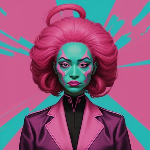 A digital painting depicting a person in a pink Mao suit holding a protest sign. The image features vibrant, triadic colors and glowing pink accents in a fauvist style with social justice themes.