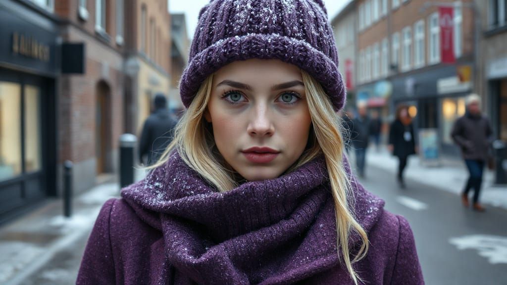 It is snowing. A young blonde woman with green eyes, beautifully made up, wearing a purple winter hat, a purple winter coat and a purple wool scarf, walks along the pavement in the centre of Luleå. Intricate details, HDR, beautifully shot, hyperrealistic, sharp focus, perfect composition, cinematic 8K, ...