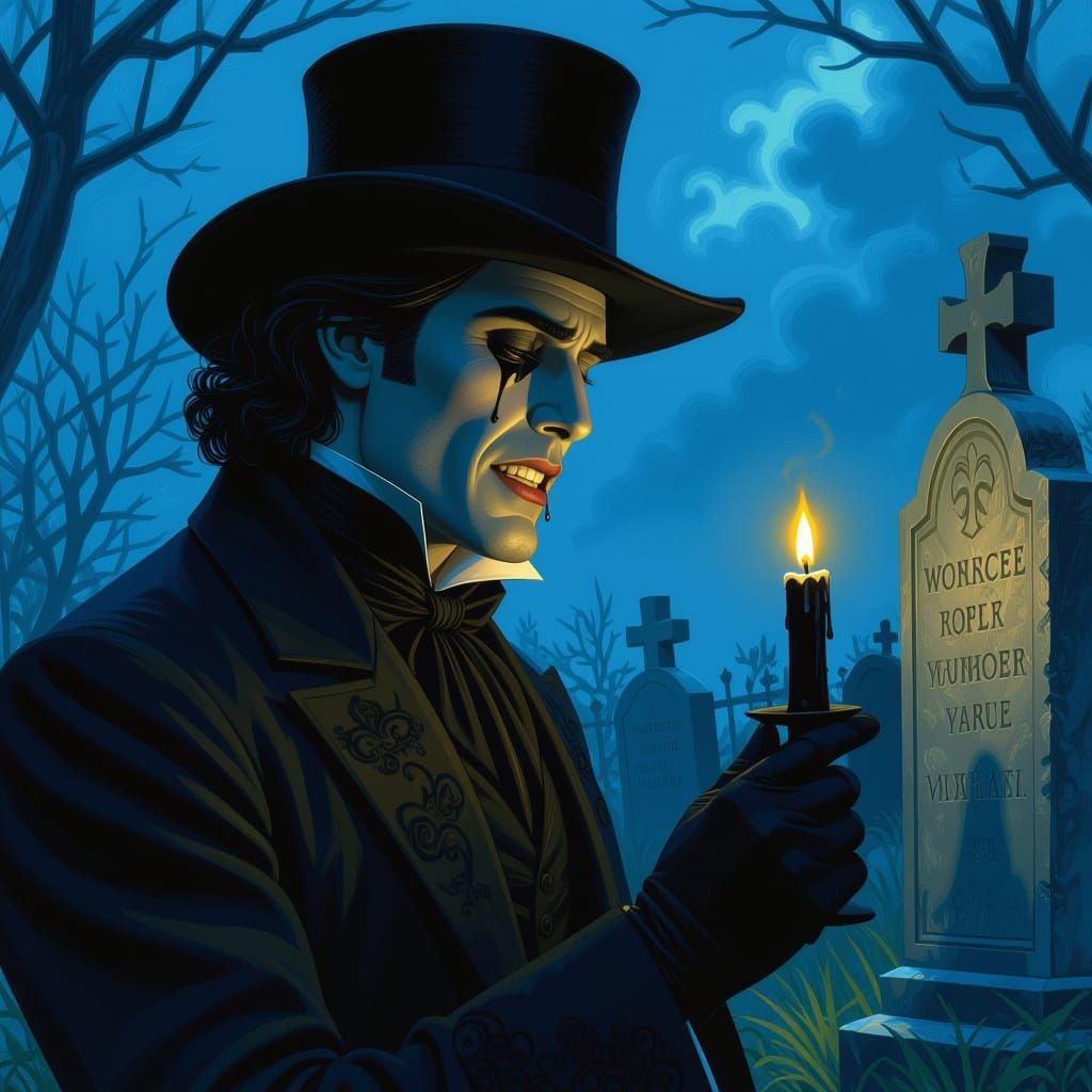 This hyperdetailed portrait shows a man in Victorian attire, holding a candle by a grave at night. His face is contorted in grief, with a single tear. The art style is intricate and features dynamic lighting.