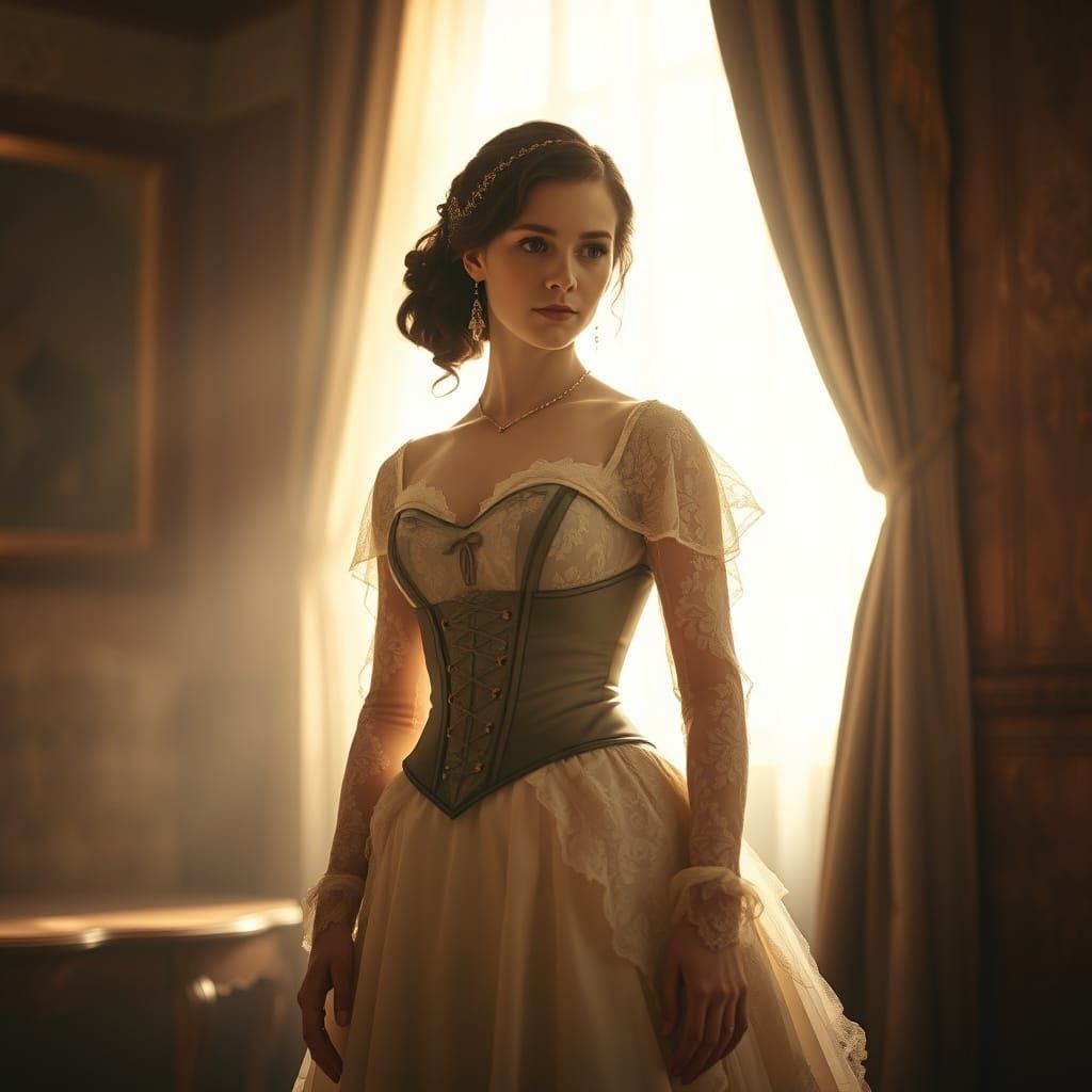 This image shows a young Victorian woman in a detailed lacy wedding dress and corset. It has a radiant, realistic look with a vintage film aesthetic and sepia tones.