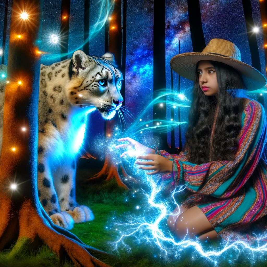 This image shows a young girl in a bohemian dress interacting with a snow leopard amidst a glowing forest and starry sky. Ethereal light and crackling lightning create a magical, hyper-realistic fantasy scene.