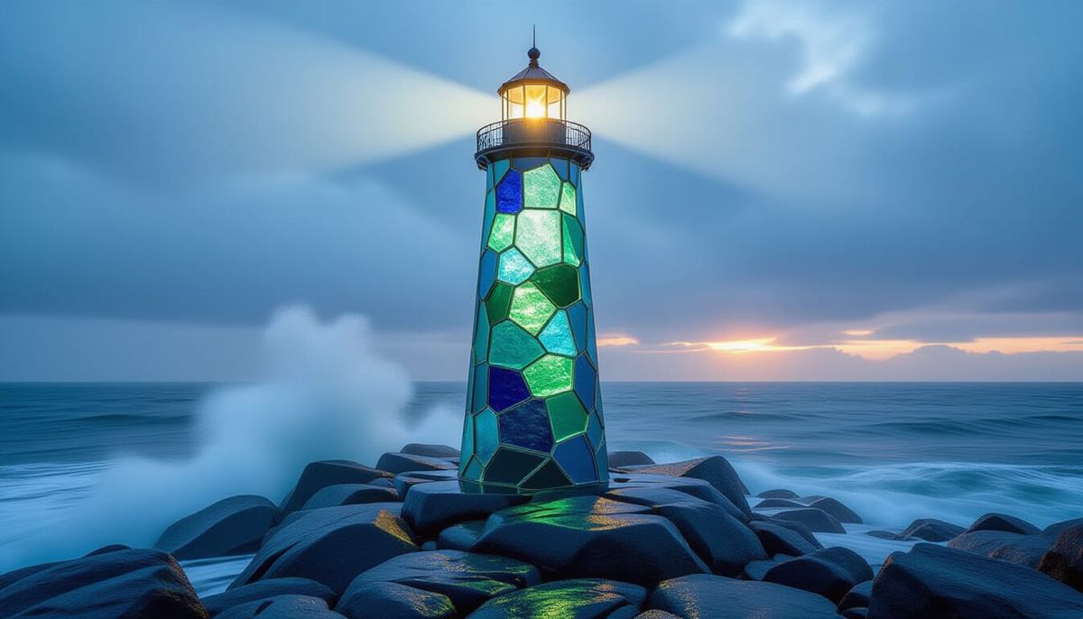 This image shows a majestic lighthouse built from colorful sea glass, standing against a stormy sea at dusk. The lighthouse beam pierces the mist, highlighting the glass textures in a photorealistic style.