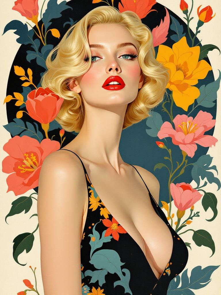 A full-body portrait of a confident blond woman with pink-tipped hair, striking a pose in a floral dress. The image features bold colors and organic elegance with decorative blooms.