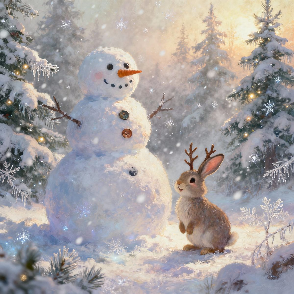This image shows a funny snowman and a cheerful rabbit in a snowy forest. The scene has a warm, festive atmosphere with soft snowfall and gentle morning light, rendered in a detailed storybook illustration style.