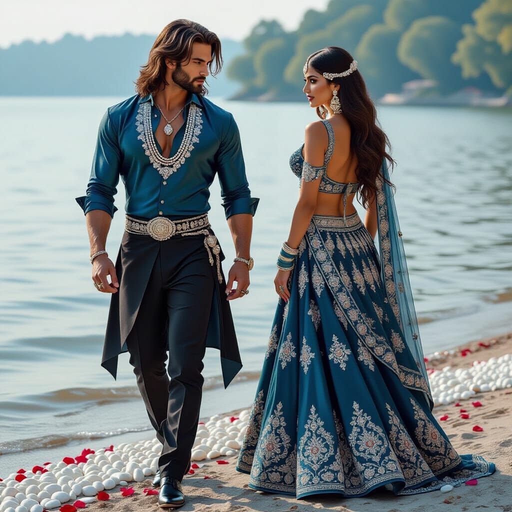 This image shows a slender man in a satin shirt walking behind a sensual woman at a lake. The scene is filled with rose petals and shells, rendered in a detailed, matte painting style with soft, cinematic lighting.