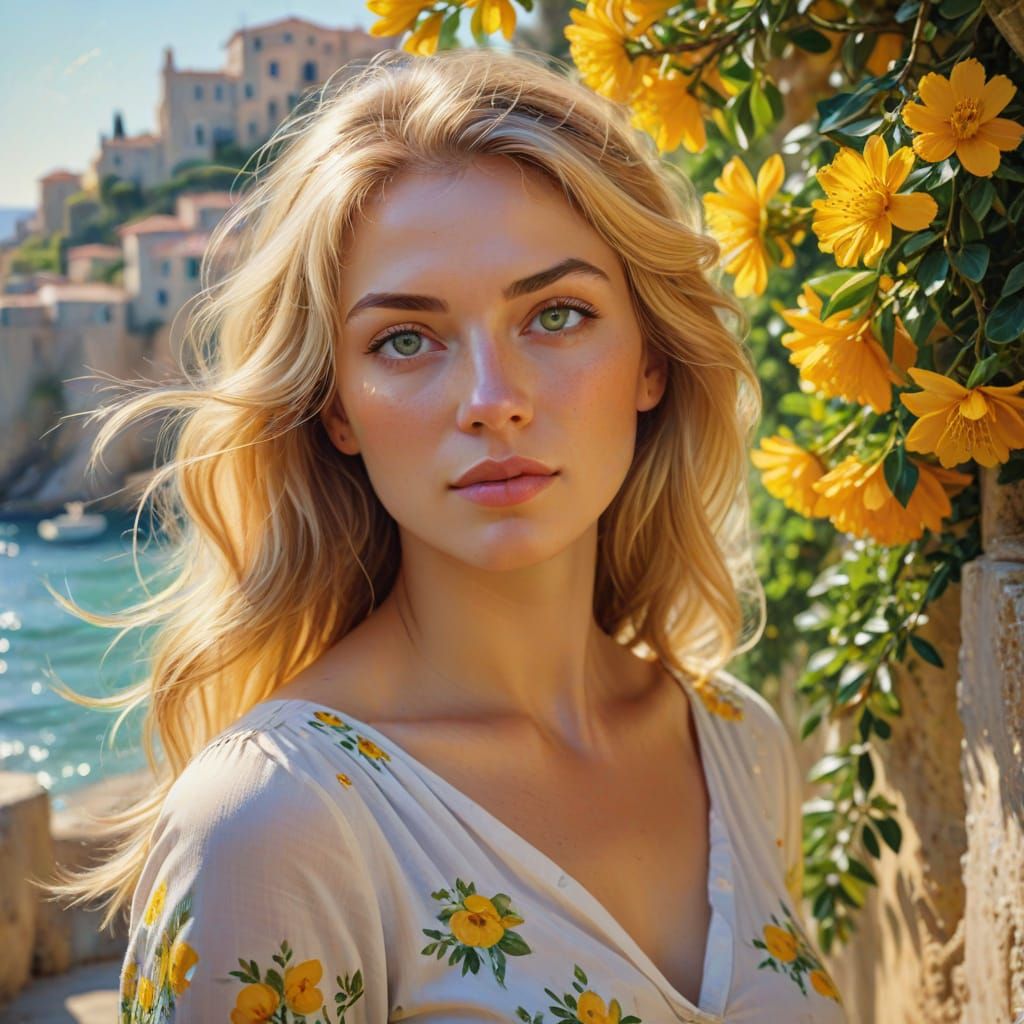 A beautiful woman strolls through a Mediterranean village in this impressionistic-style painting. The artwork features vibrant colors, delicate brushstrokes, and warm sunlight, reminiscent of an oil painting.