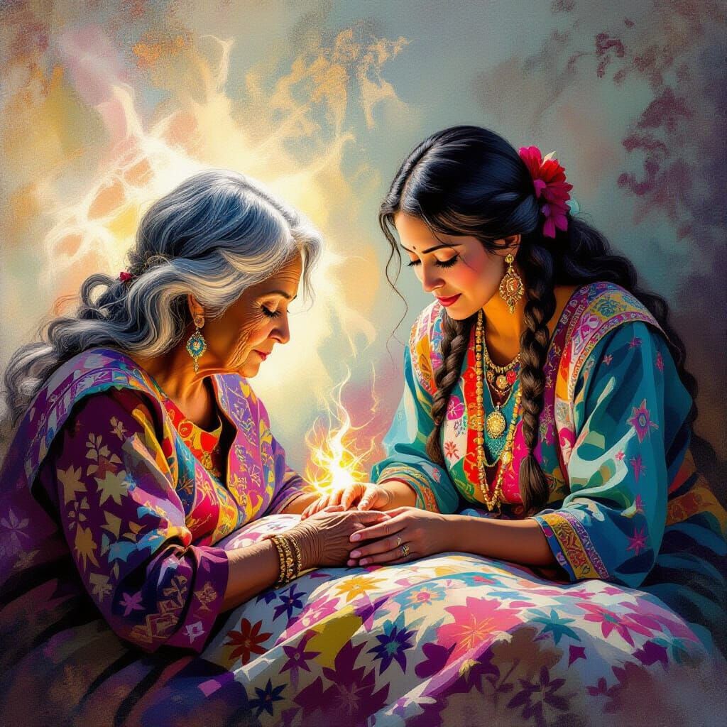 This image depicts a spiritual healing ritual performed by two curanderas on an elderly woman. The abstract art style features vibrant colors, fine details, soft ethereal lighting, and a sense of gentle energy.