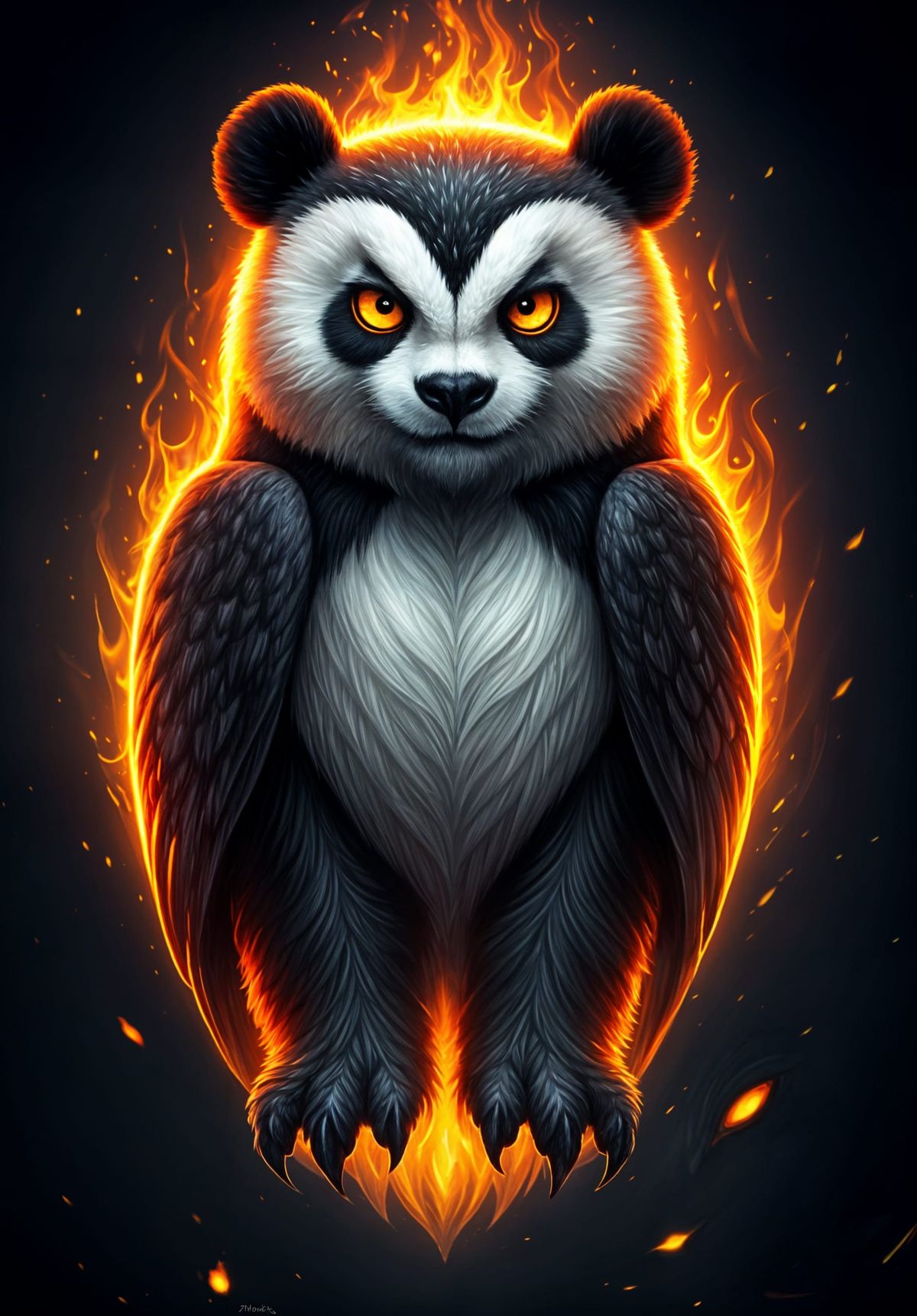 This image shows a striking fantasy creature, a hybrid of an owl and panda. It features fiery white and black fur, a panda's head, and piercing eyes, creating a powerful visual.