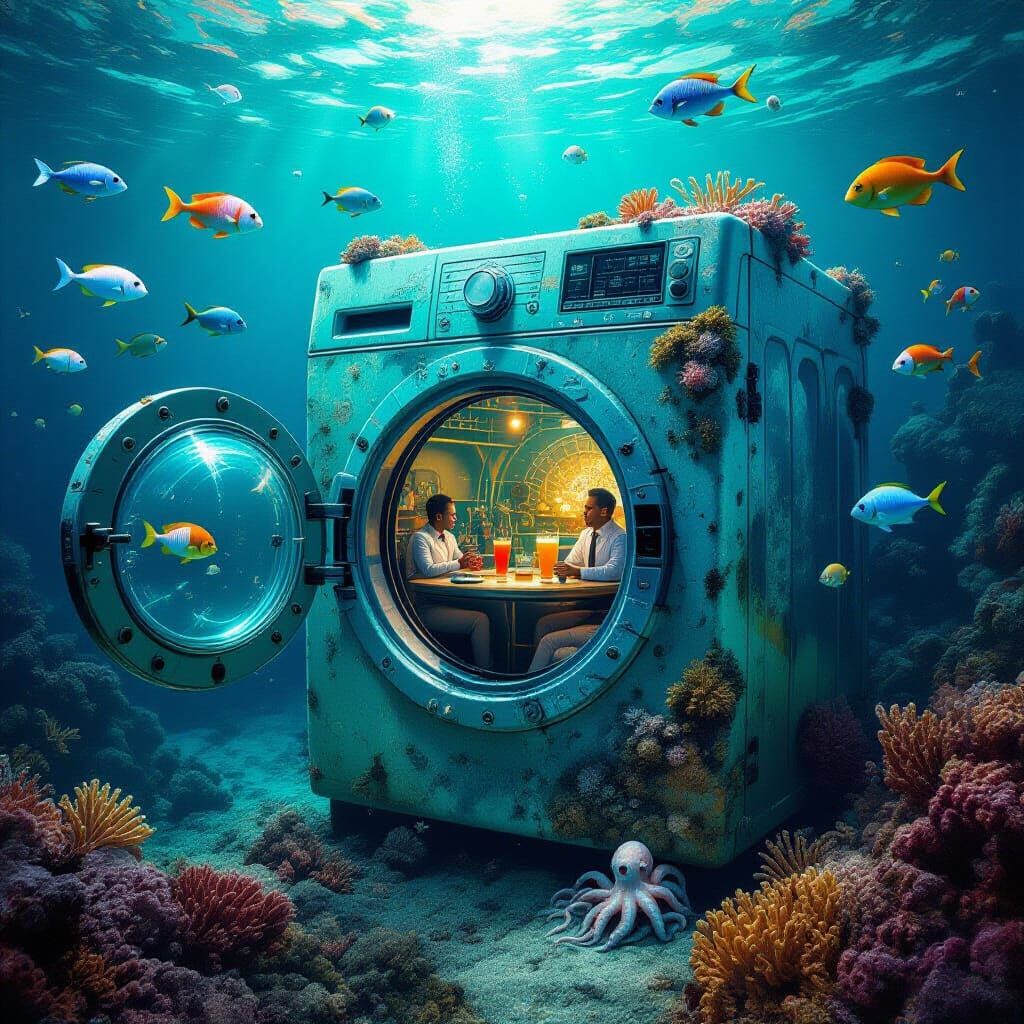 Imagine a bustling underwater jazz club thriving inside a vintage washing machine, teeming with marine life and vibrant coral formations. The washing machine, encrusted with barnacles and glowing algae, rests on the seabed, its porthole offering a glimpse into a lively scene. Fish of all colors groove to the music, while octopi serve drinks at the bar. Reminiscent of retrofuturism and bioluminescent art, with a touch of H.R. Giger's biomechanical aesthetics, creating a surreal and captivating image, with a color palette dominated by deep blues, greens, and vibrant corals, illuminated by the soft glow of underwater lights.
