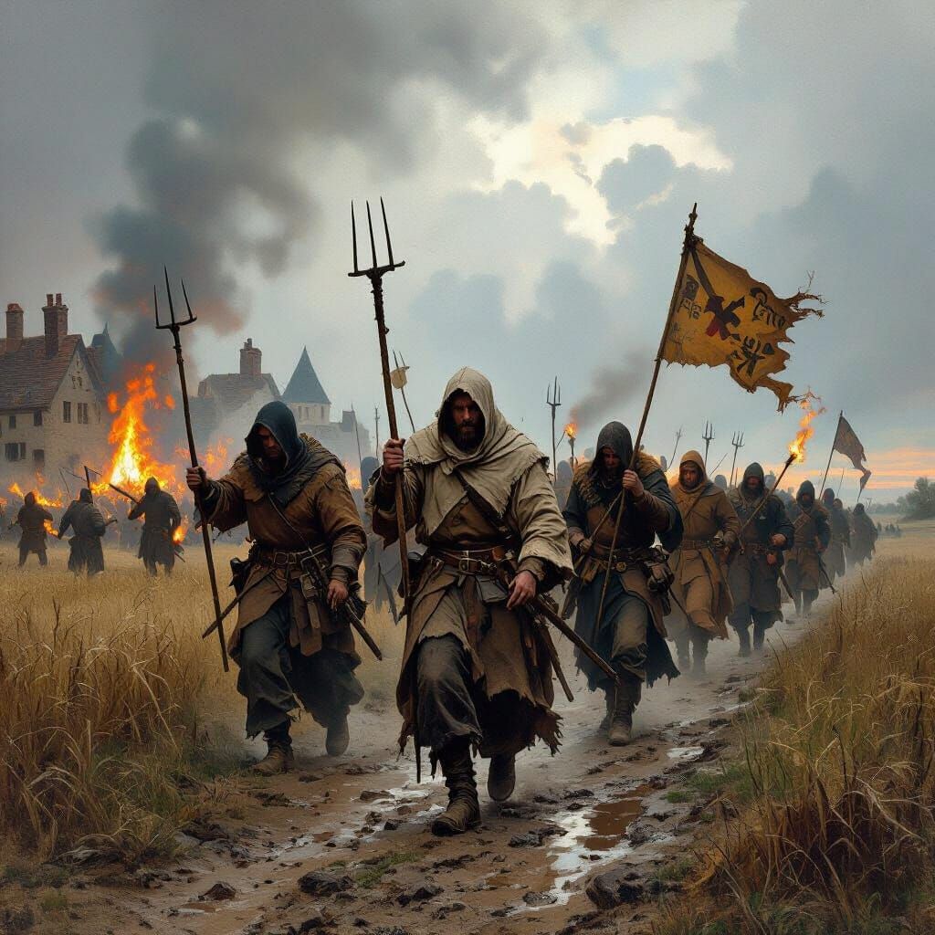 This image shows peasants revolting in 14th-century France and England. The peasants are rising up against feudal estates in a dramatic scene with cinematic lighting and gritty textures, reminiscent of historical paintings.