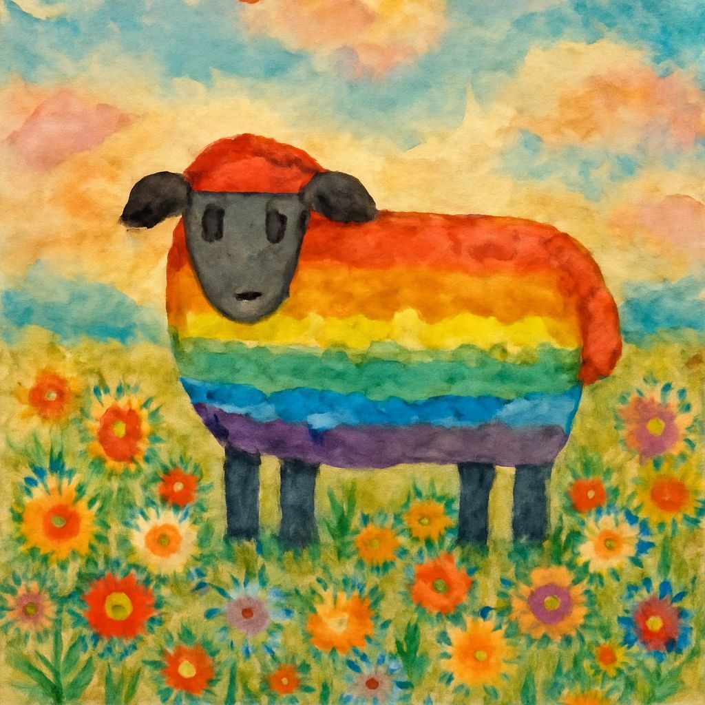 This vibrant image depicts a rainbow-colored sheep in a lush field of wildflowers, reminiscent of 1960s hippie art and childlike watercolor paintings.