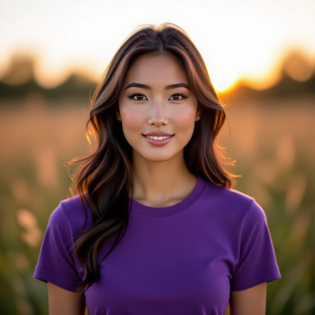 A stunningly realistic photograph of an Asian woman in a purple shirt, bathed in warm golden hour light. The shallow depth of field ensures a sharp focus on her features.