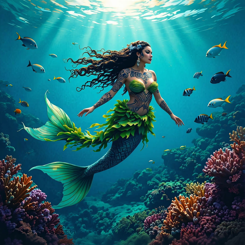 This image shows a mermaid adorned with traditional Maori tattoos swimming through a vibrant coral reef. The photorealistic style captures the beauty of the deep ocean setting.