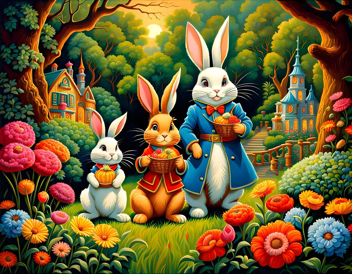 This image shows a beautiful, intricate painting of a bunny family in a vibrant fairytale garden, surrounded by ornate details and iridescent colors, reminiscent of vintage illustration art.