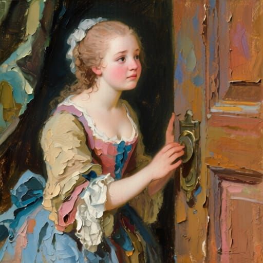 This image shows a bashful maiden at a door, rendered in a realistic 18th-century oil painting style with thick, textured brush strokes reminiscent of gouache and watercolor.