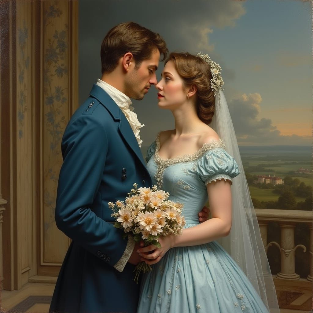 Encostados à balaustrada superior do palácio, sob afrescos dourados e colunas esculpidas, um casal apaixonado contempla o salão abaixo. Ela, vestida em azul celeste, carrega um delicado buquê de lavandas recém-colhidas. Ele, de expressão doce, segura um presente embrulhado em linho marfim com a inscrição ...