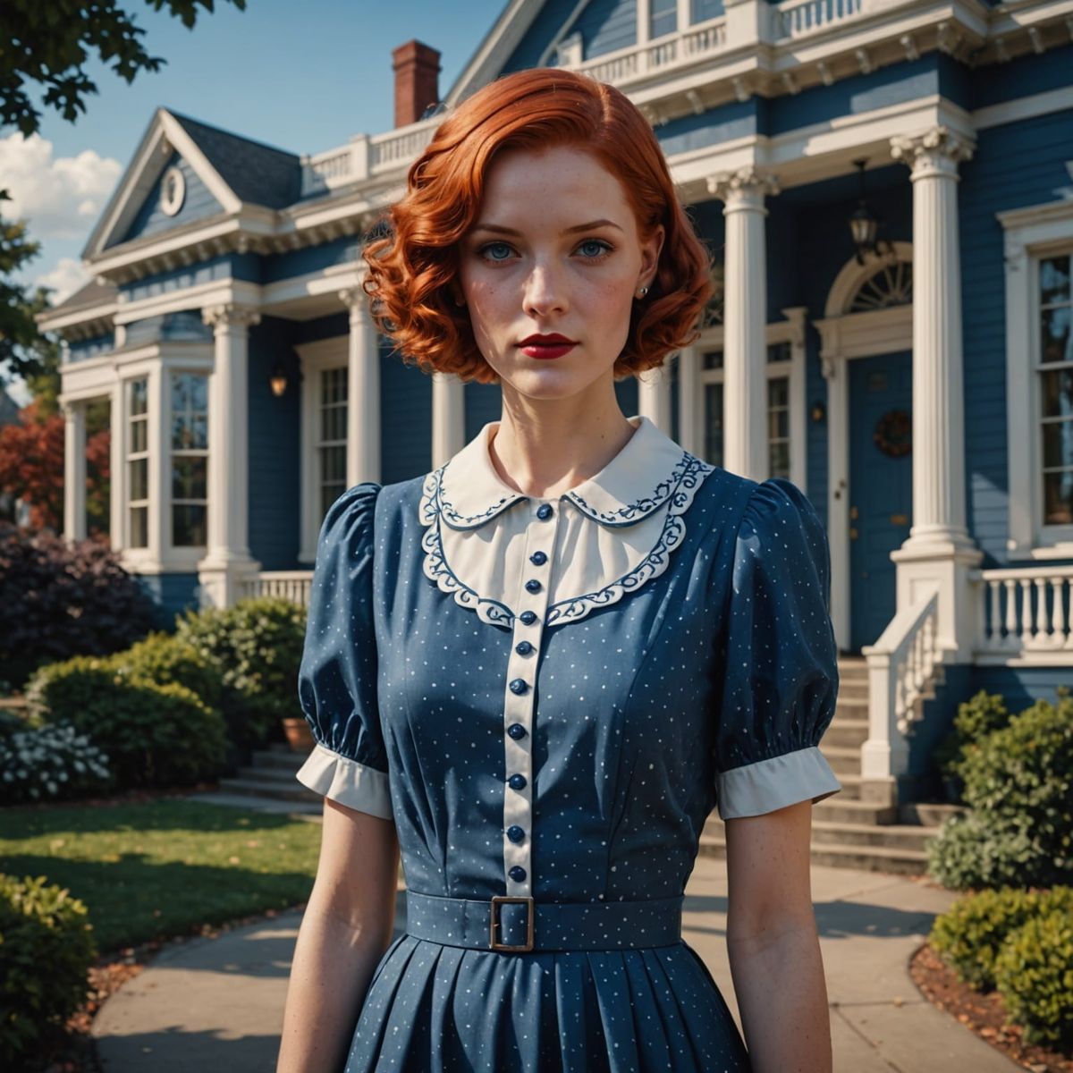 This image shows a young red-haired woman in 1930s attire standing outside a music hall. She is wearing a blue and white dress and matching shoes, depicted in a detailed digital painting style.