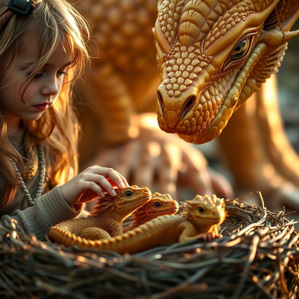 A mother dragon watches over her precious young, as two curious girls gaze in wonder at the nest, surrounded by the warmth and magic of a golden sunset.