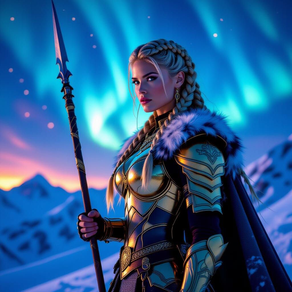 A striking picture of a Valkyrie warrior in golden armor on a snowy mountain. The aurora borealis swirls in the background in this portrait with hyperdetailed textures and dramatic lighting.