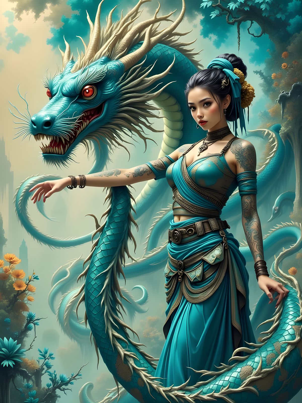 This image shows a dancer in a scale-pattern sari performing before a giant Asian dragon. The watercolor painting features intricate details and teal, indigo, and silver gradient lighting.