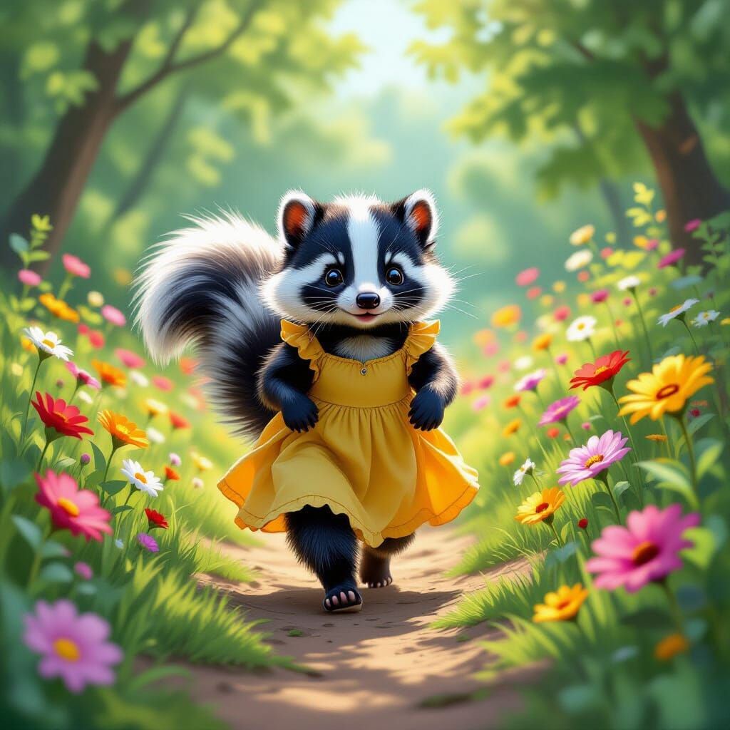 This image shows a cute skunk in a sundress walking a flower trail. Rendered in a hyperrealistic comic book style, the skunk is surrounded by vibrant flowers and greenery.
