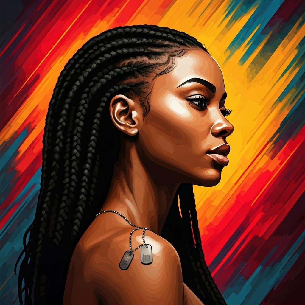 A hyperrealistic mid shot of a black woman with braided hair and a military dogtag tattoo. Side lighting accentuates her features against a vivid, colorful backdrop with rich detail.