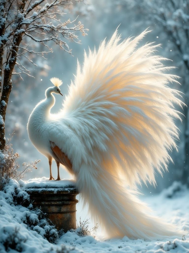 A detailed digital illustration captures a regal white peacock in a snowy garden at twilight. Wildlife photography style with soft, cool lighting highlights intricate feather textures against a dreamy bokeh background.