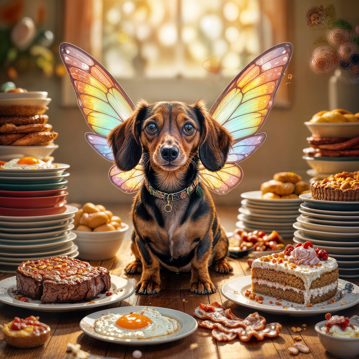 This image shows a red dachshund with colorful fairy wings surrounded by plates and bowls of food. The dog is happily eating steaks, eggs, bacon, cakes, and ice cream, resulting in a very round stomach.