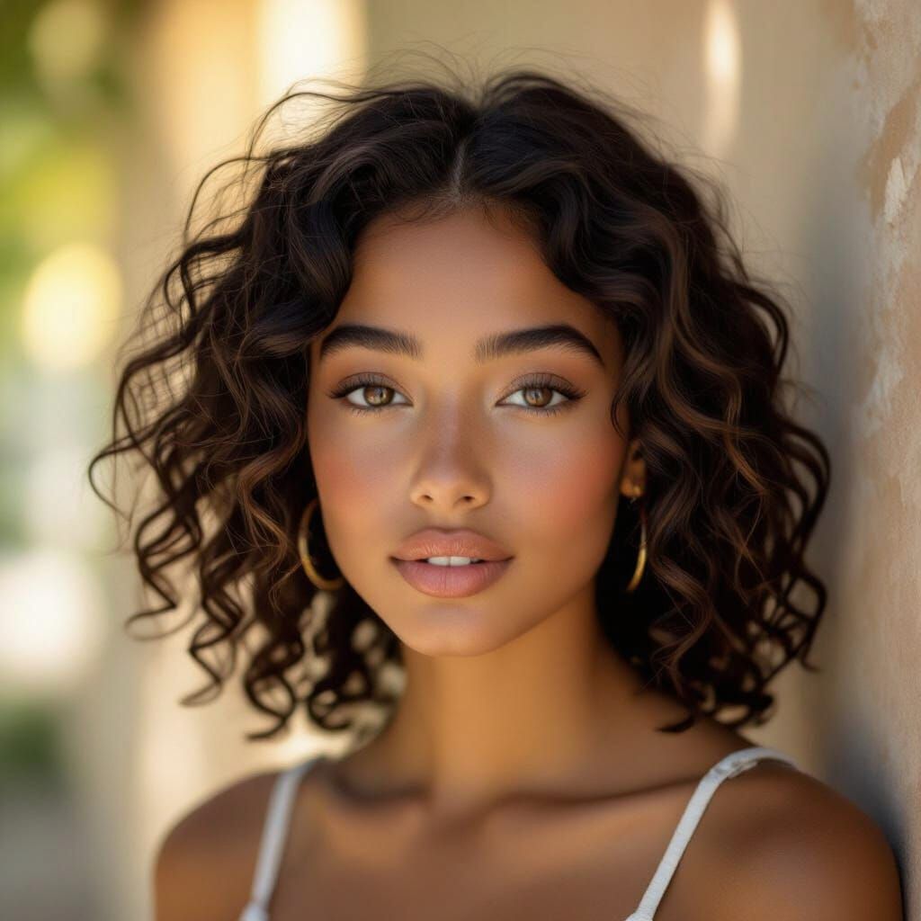 This photorealistic image captures a 17-year-old with tanned skin, curly black hair, and brown eyes, enhanced by natural makeup. Dappled sunlight creates a soft lens flare, with a shallow depth of field.