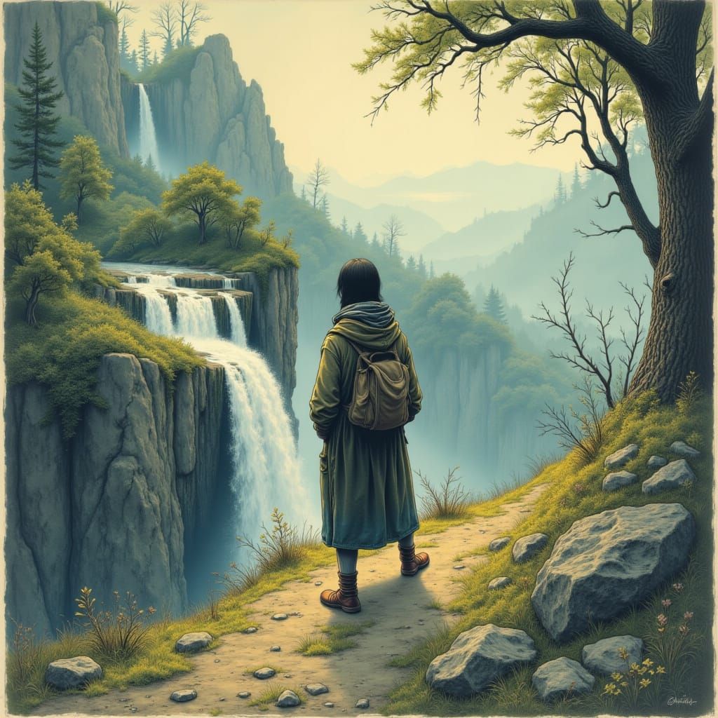 This image shows a tranquil islander amidst a flourishing landscape. The scene is depicted with warm sunlight and soft waterfalls, rendered in a whimsical cross-hatching style with intricate lines and textures.