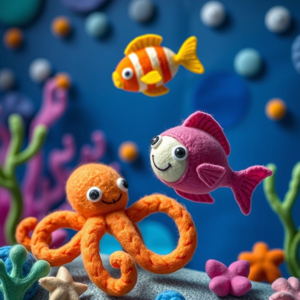 This image shows felt fish and an octopus in a colorful felt underwater scene. The bright colors and dynamic contrast evoke a whimsical and playful aesthetic.
