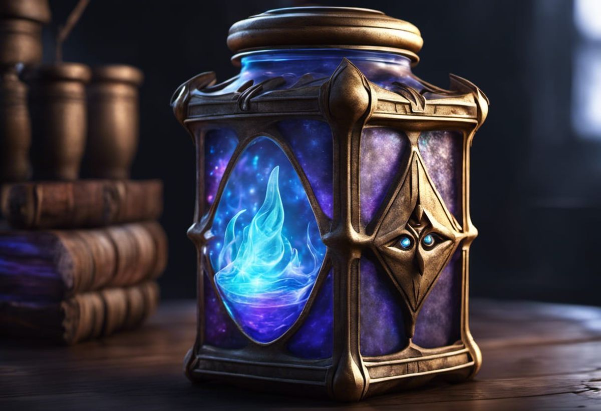 A photorealistic image shows a magical soul container with fantasy tech elements. The jar-like phylactery emits arcane spirit energy, combining medieval enchantment with dark, corrupted aesthetics.