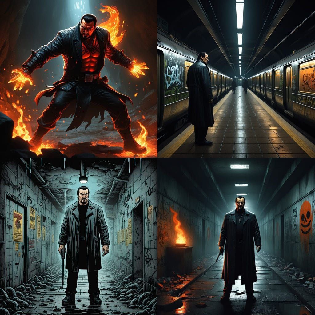 This image depicts Steven Seagal rendered in a dark, whimsical Tim Burton style, presented as underground comix graffiti. Trending on Artstation.