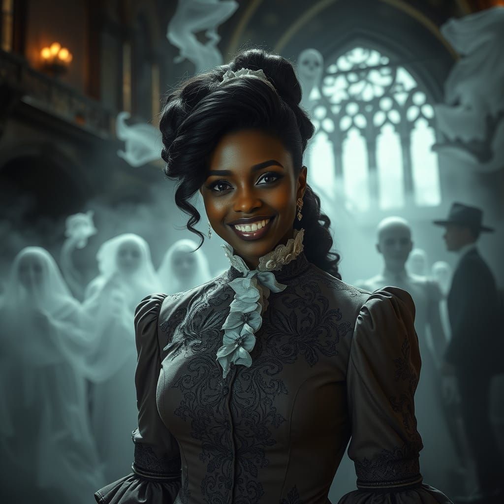 This haunting image features a beautiful dark-skinned woman in Victorian attire surrounded by ghostly figures amidst eerie mist in a dimly lit Gothic castle, blending realism with mystical atmosphere.