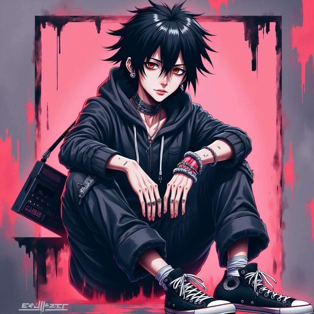 This image is a digital art representation of a young man with shaggy black hair and silver streaks, wearing a faded hoodie and dark jeans, surrounded by a warm, glitchy aura reminiscent of anime and Japanese manga styles.