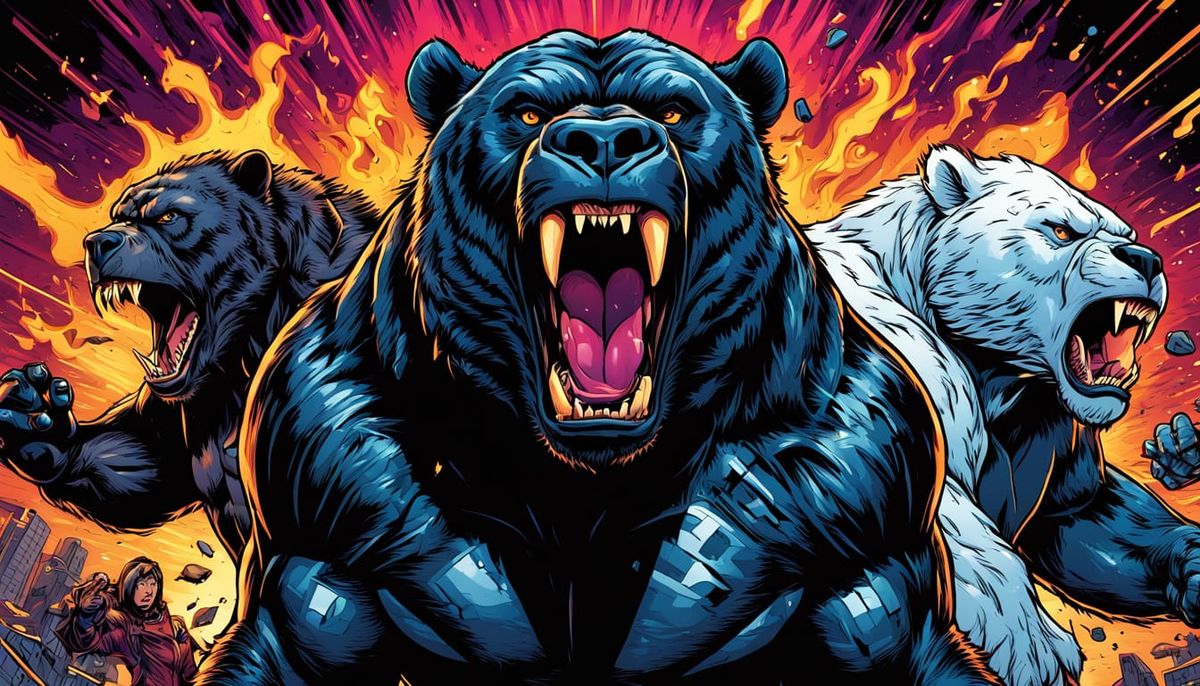 This image shows a band of animal musicians performing on stage in a hyperrealistic comic book style. The animals are wearing spiked leather jackets and the stage is lit with vivid colors and dynamic lighting.