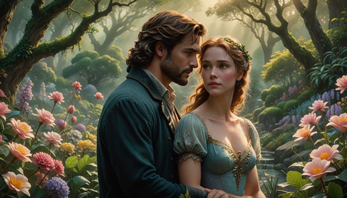 This delicate watercolor image depicts Adam and Eve in the Garden of Eden, surrounded by lush greenery and vibrant flowers, with intricate details of leaves and petals, and a muted color palette with soft, warm pastel tones, evoking a sense of wonder and enchantment.