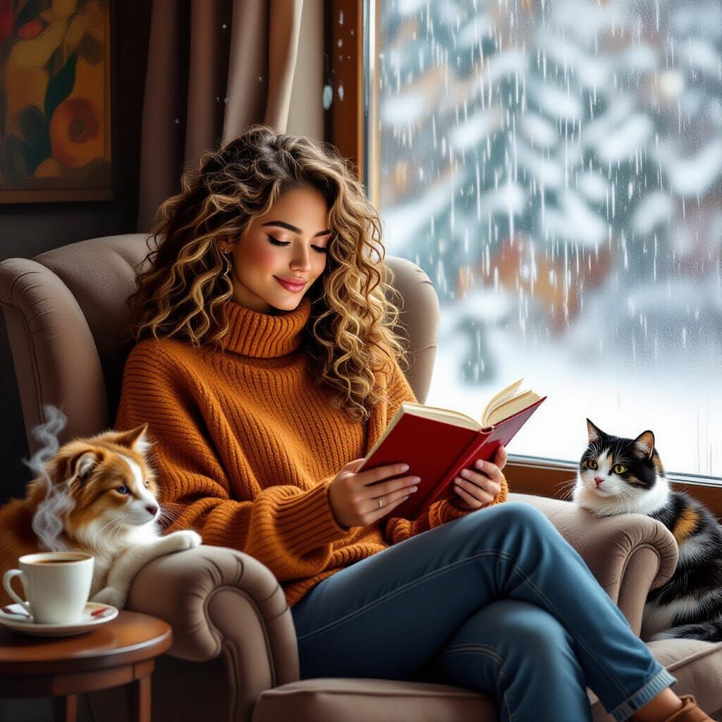 A serene image of a woman reading by a rain-streaked window, accompanied by her dog and cat. The artwork has bold colors and textures, in an abstract style with intricate patterns.