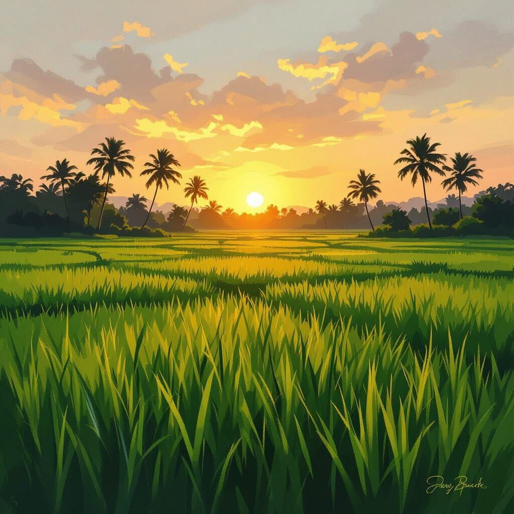 A serene paddy field scene at sunset, showcasing lush greenery and palm trees. This image evokes an impressionist style, utilizing warm golden lighting and soft brushstrokes to capture the tranquil landscape.