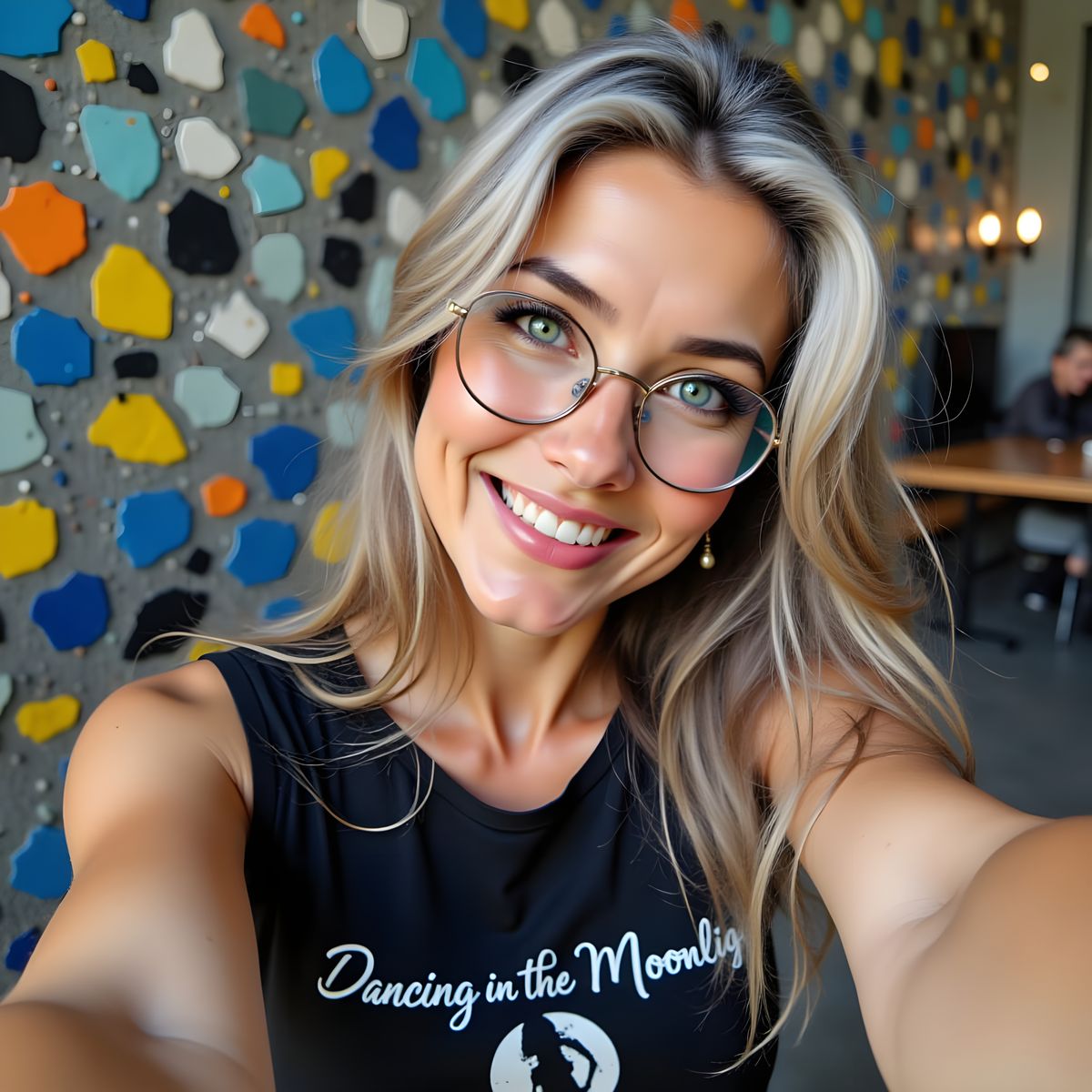 A close-up image of a middle-aged woman with silver hair smiling as she takes a selfie. She wears a "Dancing in the Moonlight" tank top. The background is a vibrant, colorful mosaic wall. Natural light creates subtle shadows.