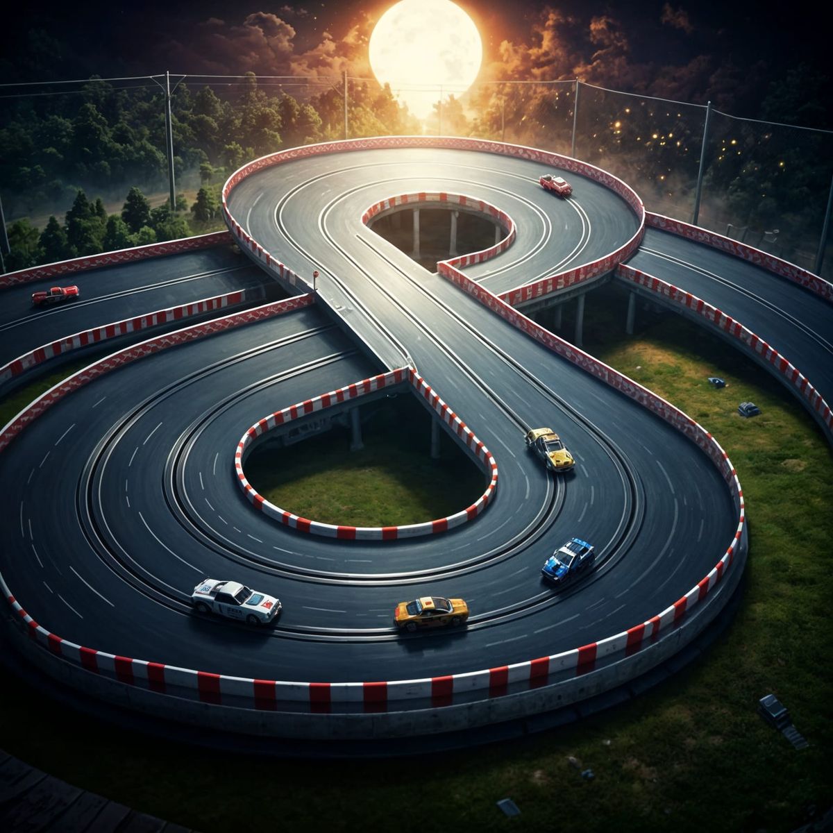 This image showcases a large, intricately detailed slot car track shaped like the number eight, with red and white striped sections and miniature cars speeding along it, rendered in a hyperrealistic style with dramatic lighting and colorful background.