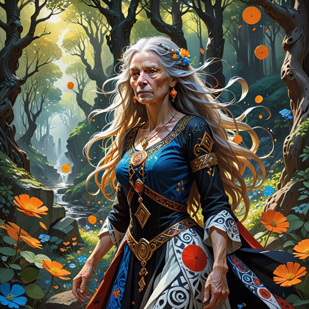 This vibrant Pop Art illustration depicts an old woman with long hair and a mystical look standing in a lush Love Forest, surrounded by intricate Celtic patterns, runes, and dynamic lighting, blending styles from Klimt to James Gurney.