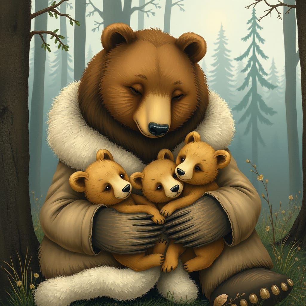 A heartwarming image of a mother bear embracing her cubs in a peaceful forest setting. This artwork evokes a whimsical, earthy, and delicately lined style.