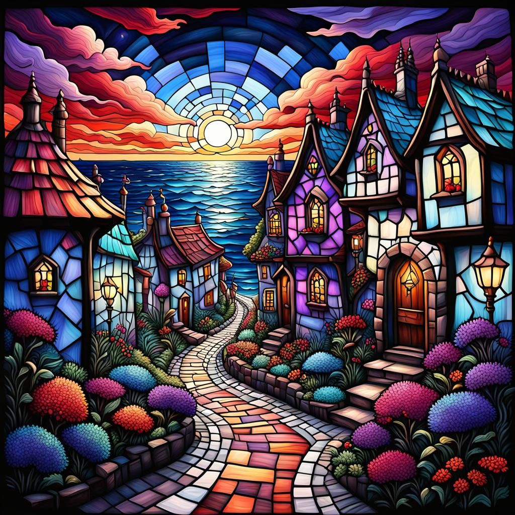 This image shows a stained glass road winding through a village toward the sea. The scene is rendered in black and white, with pops of sporadic color and a surreal aesthetic.