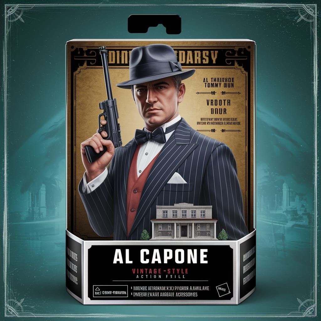 This image showcases a hyperrealistic depiction of Al Capone as a vintage action figure, complete with a tommy gun, fedora, and pinstripe suit. The retro-style packaging features gritty artwork and bold labels, reminiscent of classic crime films from the 1920s.